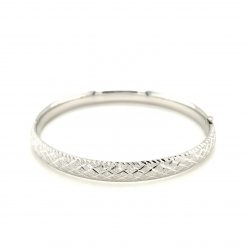 14k white gold, this bangle is accentuated with diamond carved accents and features a hidden clasp.