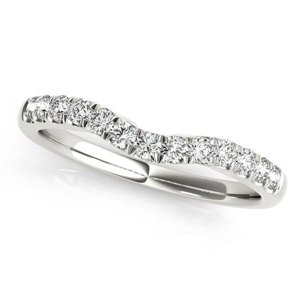 Showcasing, brilliant round diamonds this alluring wedding band features a lovely curved design made of 14k white gold.