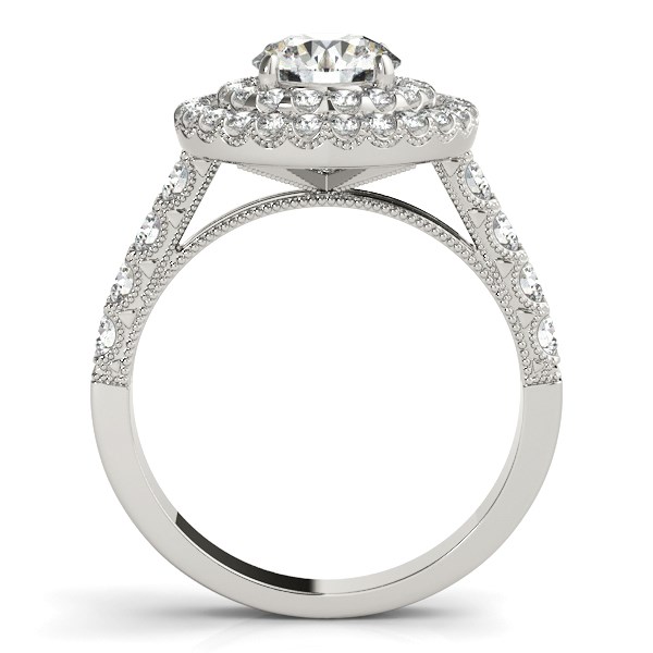 The showcasing a center round cut diamond, this stunning engagement ring features smaller pave set dual halo and intricate shank detailing. Designed in 14k white gold.