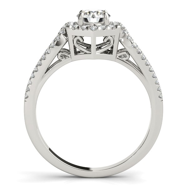 A brilliant round cut diamond is highlighted by the pave set smaller stones on a hexagon halo border of this engagement ring showcasing a teardrop split style shank, this ring made of 14k white gold.