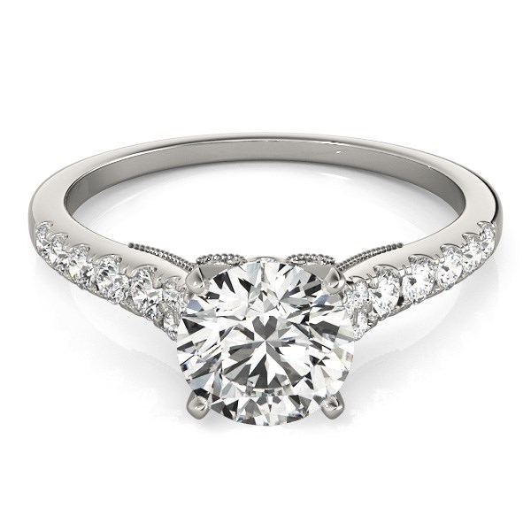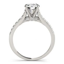 The scallop set single row shank highlights the elegance of the round diamond of this enchanting ring. Made of 14k white gold.
