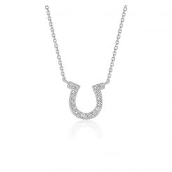 This classic diamond horseshoe design pendant features a 16 inches cable chain. Made of 14k white gold, this comes with a lobster lock.