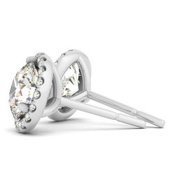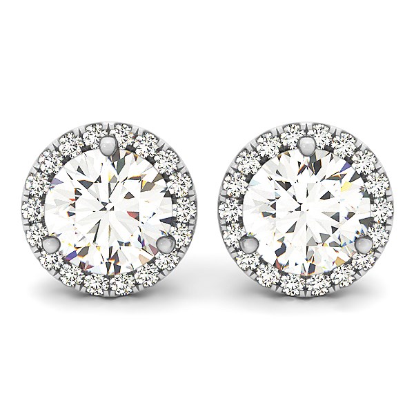 Featuring, refined elegance these round diamond earrings showcase a halo design and a center diamond with martini setting made of 14k white gold.