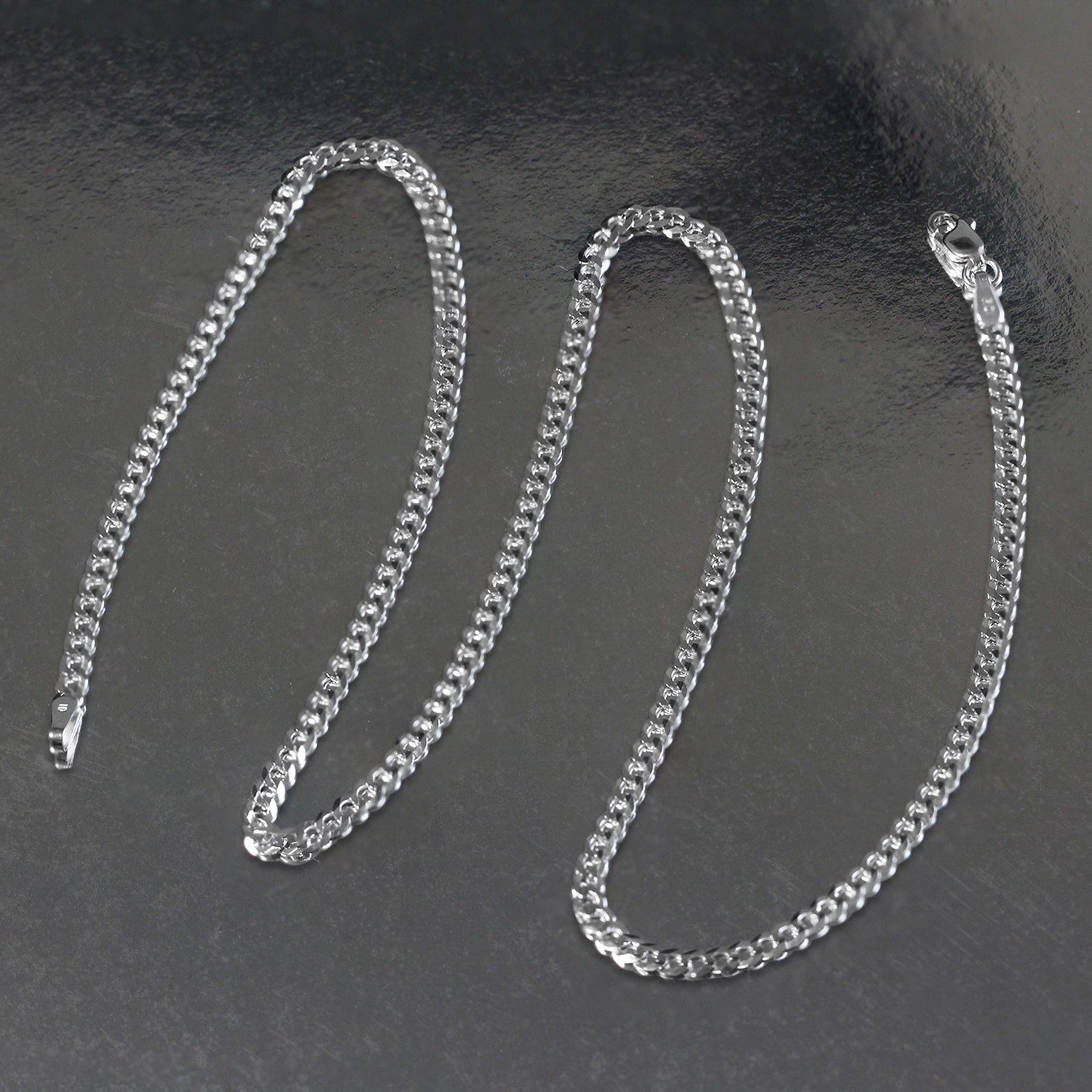 This solid curb chain comes in 14k white gold and has a width of 2.6 millimeters.