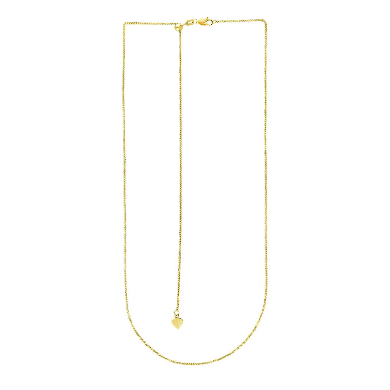 Crafted in 14k yellow gold, this adjustable wheat chain measures a width of 1.00 millimeters and features a heart dangle accent. This chain is available in two sizes adjustable up to 22 inches and 30 inches and is fastened securely with a lobster clasp.