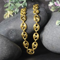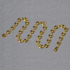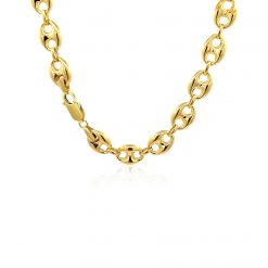 This puffed mariner link chain comes in 14k yellow gold and has a width of 9.0 millimeters.