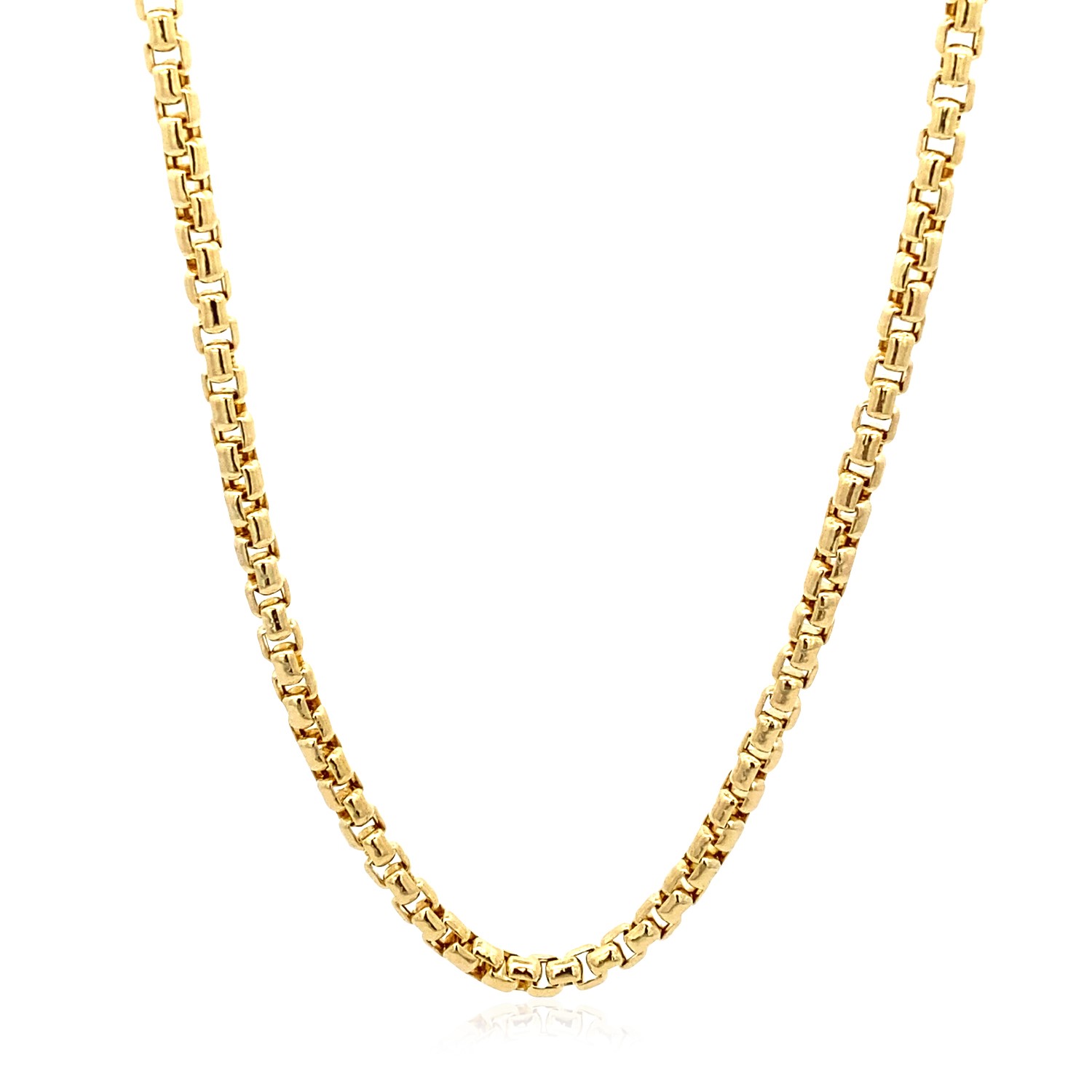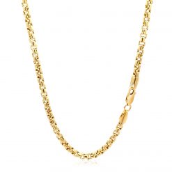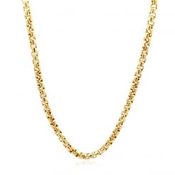 This round box chain comes in 14k yellow gold and has a width of 3.4 millimeters.