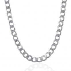 This classic rhodium plated chain is crafted in gleaming sterling silver and has a width of 8.40 millimeters. Featuring a curb chain design, it is secured with a lobster clasp.