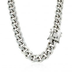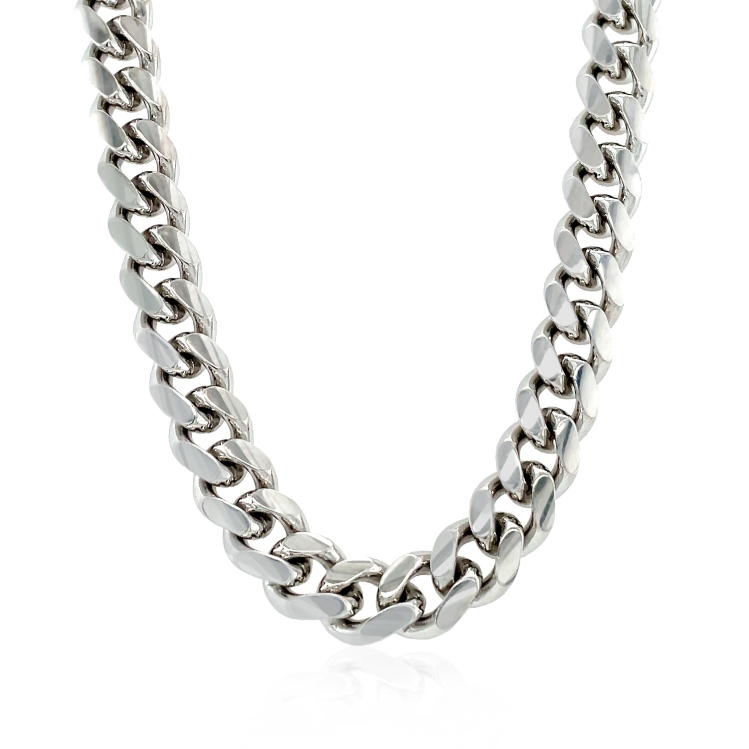 This rhodium-plated miami cuban chain comes in sterling silver and has a width of 8.40 millimeters.