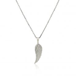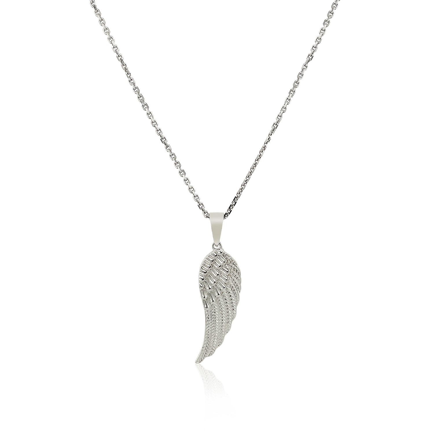 Bold and inspiring, this wonderful sterling silver pendant is graced by a single fluttering angel wing with beautiful textured details. Pendant is 18 inches long and closes with a lobster clasp.